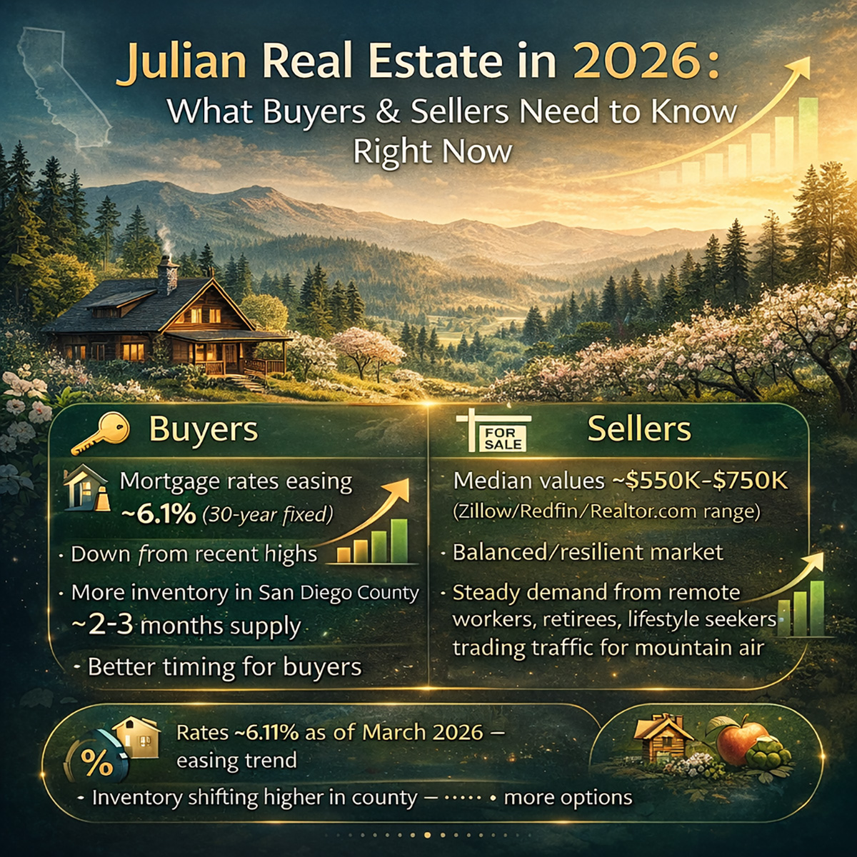 If you’ve been watching the Julian real estate market — or thinking about making a move — spring 2026 is shaping up to be a genuinely interesting moment. Mortgage rates have eased from their recent highs, inventory across San Diego County is shifting, and Julian continues to attract a growing wave of buyers who’ve decided that trading traffic for mountain air is well worth it.
